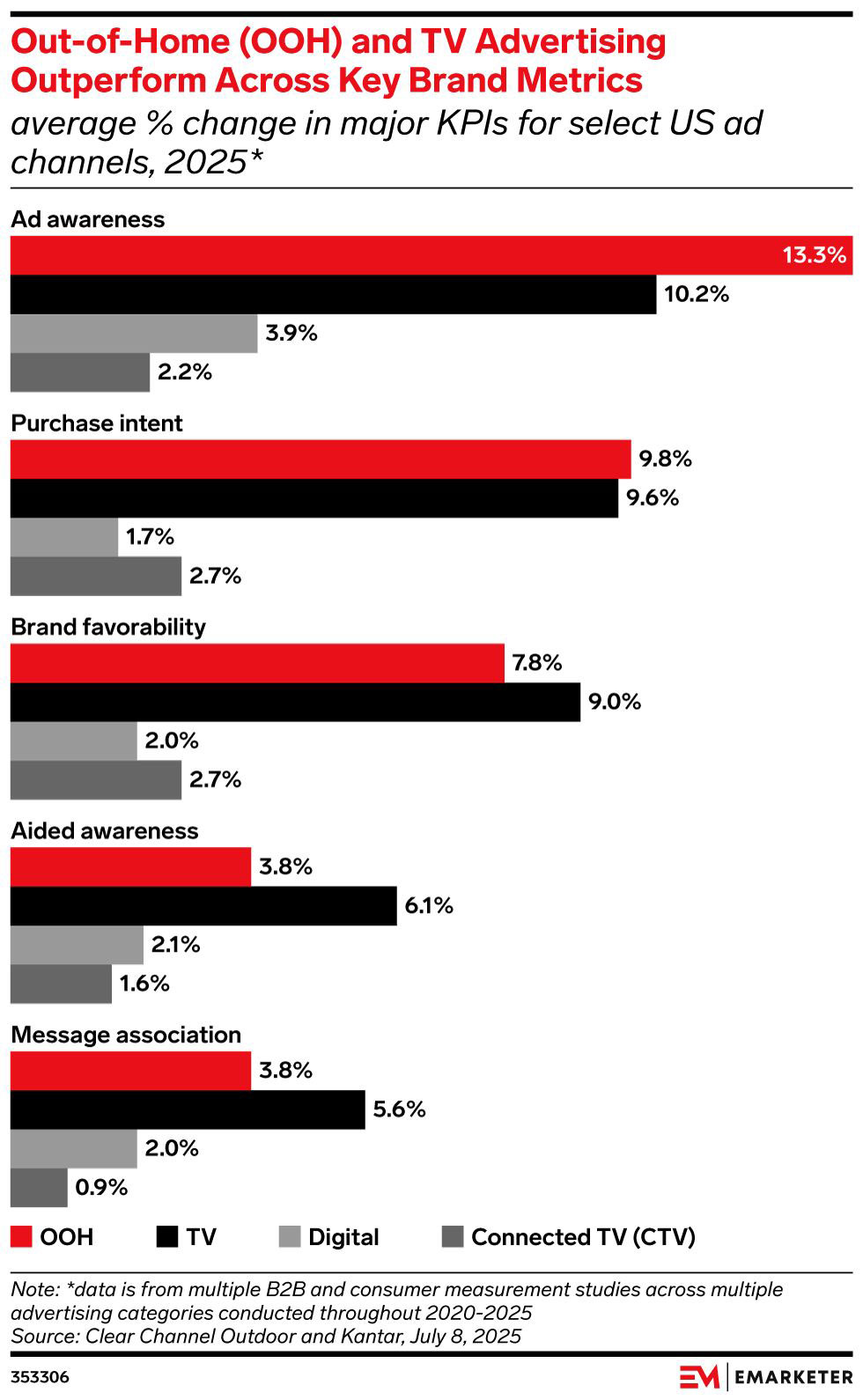 Further supporting this, a five-year study by Clear Channel US and Kantar found that OOH drives higher ad awareness than digital media and rivals TV in effectiveness. Notably, OOH leads in purchase intent, outperforming TV, CTV, and digital channels.