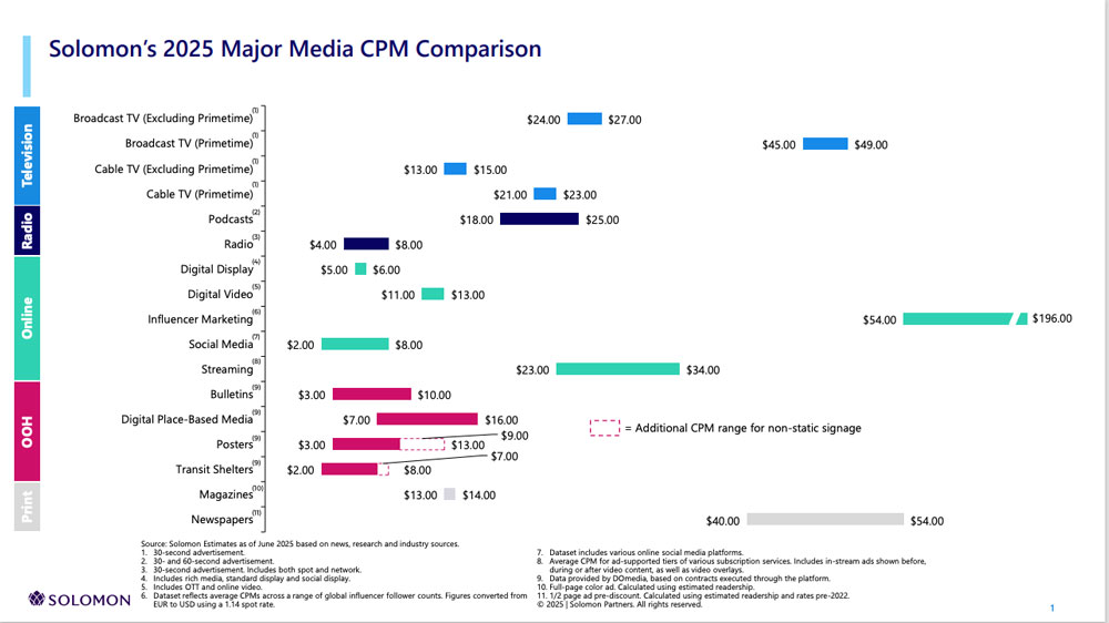 Cost effectiveness is another key advantage of the medium. Recent CPM comparisons from Solomon Partners show that OOH delivers the highest ROI in audience reach. As marketing budgets tighten and advertisers demand more measurable results, OOH stands out as a smart investment.