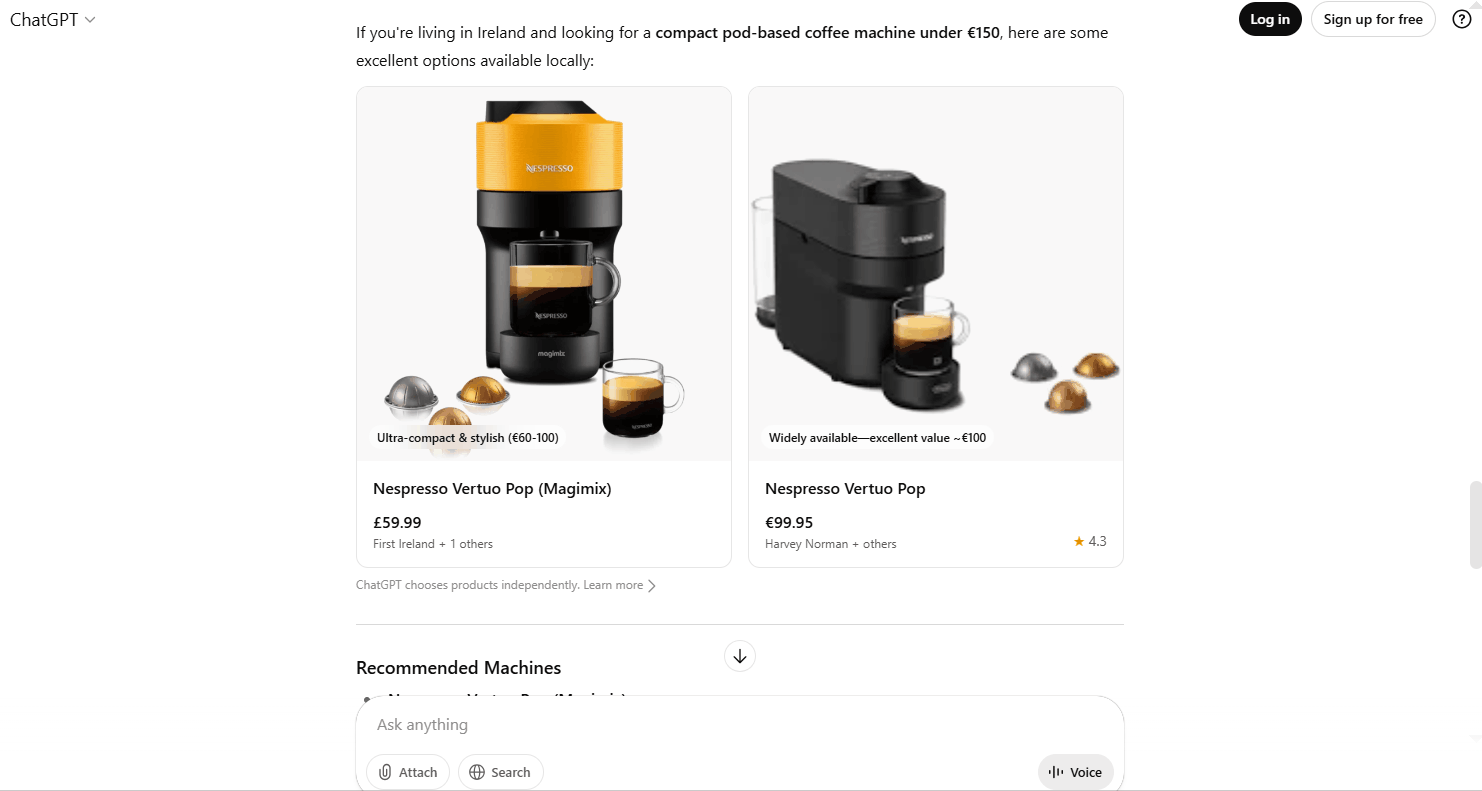 When ChatGPT detects purchase intent within a conversation (e.g. “espresso machine for a tiny kitchen”), it weighs a mix of signals to showcase products: