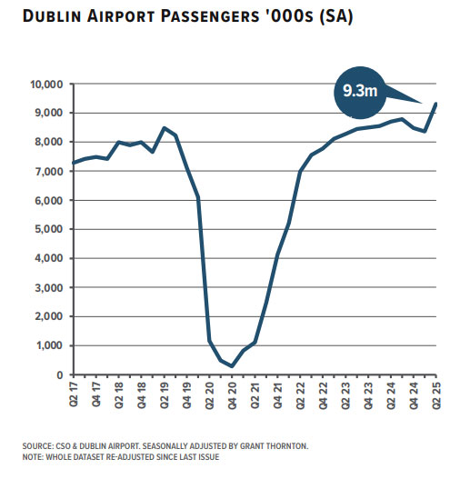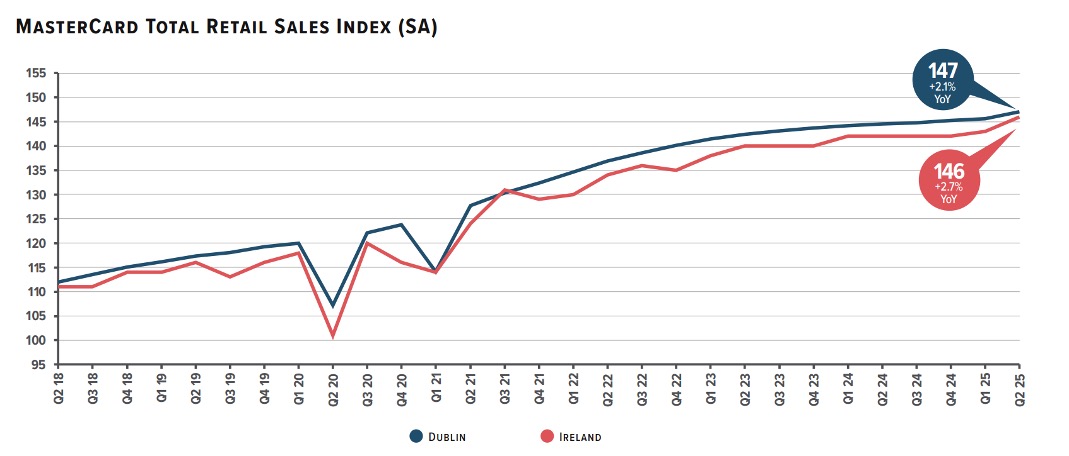 When it comes to consumer activity, resilience remains clear, even in the face of higher household costs. Dublin retail sales climbed to a record high index of 147.4 in Q2, part of a five-quarter upward trajectory. Nationwide, card payments on retail and health are now approaching €10 billion monthly, highlighting the sheer scale of daily consumer activity. Employment is also at a record figure in Dublin, meaning the cities are surging with footfall during the week as offices return to regular patterns of in-person meetings.