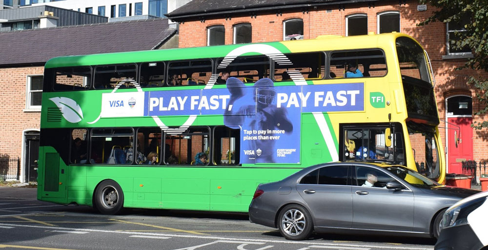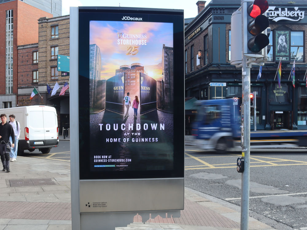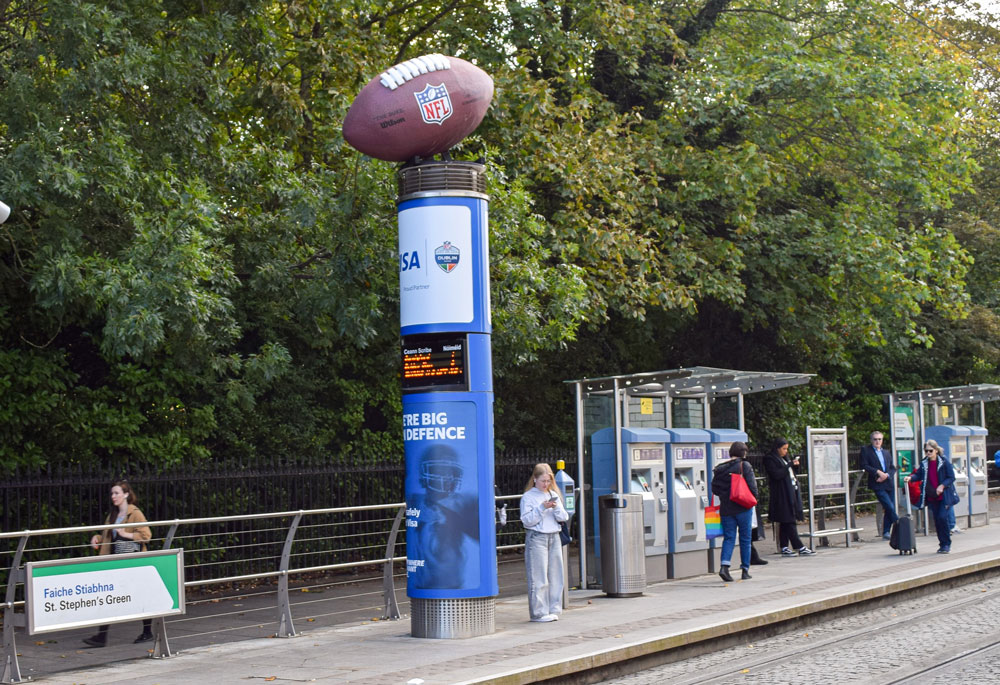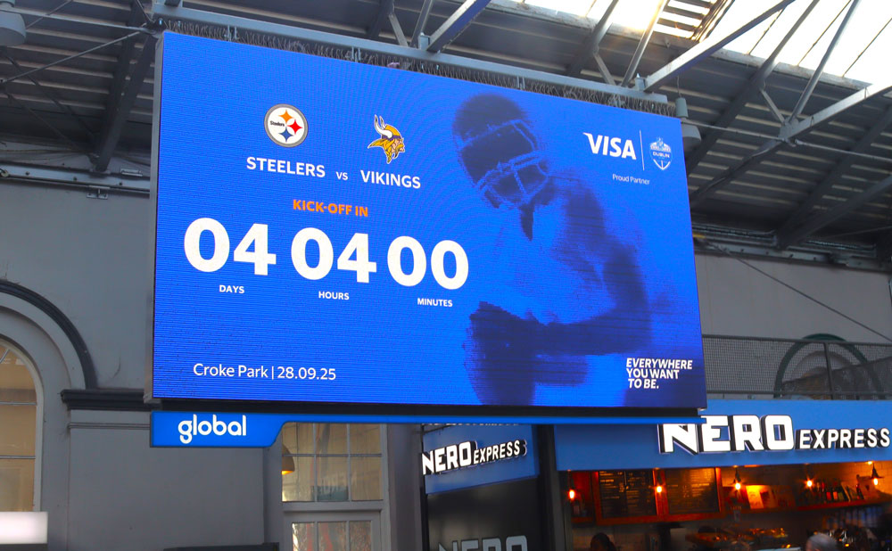 Visa, through Zenith, is running dynamic messaging in the run-up to, during and after the 2025 NFL Dublin Game encompassing a countdown, live match score and congratulations message on Transvisions in transport hubs, and the Green Screen at Stephen’s Green Shopping Centre, all delivered via the Liveposter platform.