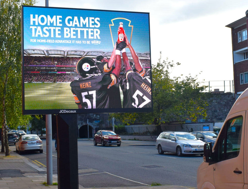 Heinz is espousing home-field advantage in its celebratory message. The company has had a long association with the city and the football team with Pittsburgh Steelers’ home stadium previously known as and Heinz Field. The Steelers are owned by the Rooney family who emigrated from Newry in the 19th century. The multi-format campaign planned by Dentsu appears on 48 Sheets, Digital billboards and Bridges and Bus T-Sides.