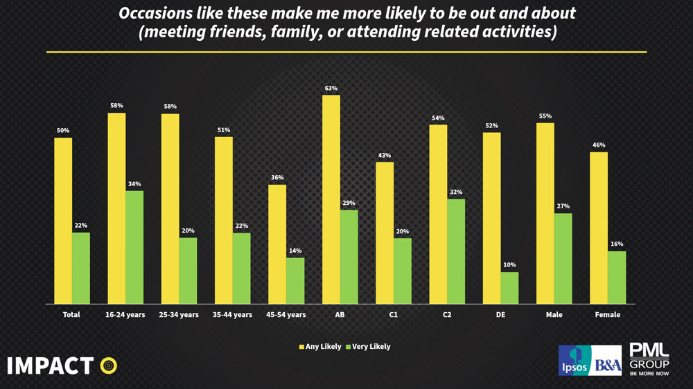 Latest findings from our iQ study with Ipsos B&A show just how much that matters for Outdoor audiences. Half of Dubliners say major sporting occasions make them more likely to be out and about, meeting friends, travelling to venues, or watching games together. The figure climbs to among 16-24s and 25-34s, confirming sport as a consistent driver of social movement and city-centre activity.