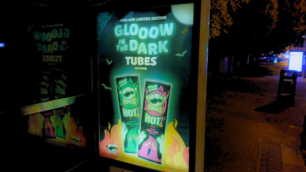 There’s also a little visual magic at play. Select Metropole sites feature JCDecaux’s MetroGlo print technique, subtly enhancing the brightness of key creative elements after dark. The effect gives the Pringles moustache and lettering a spectral lift, mirroring the glow-in-the-dark effect of the tubes themselves. The campaign mirrors wider international activity, with UK counterparts also embracing the brand’s ‘gloooow in the dark’ theme through similarly illuminated panels.