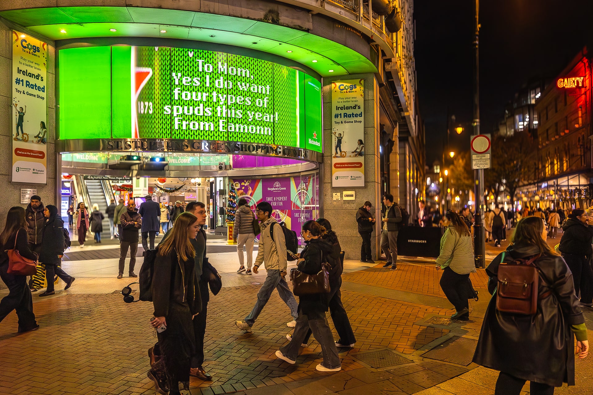 In partnership with OOH media agency Talon, media agency dentsu, creative agency Thinkhouse and website LadBible, Heineken invited Dubliners to bring their personal Christmas messages in a uniquely innovative way. As LadBible captured the spontaneous messages from people on the street, Thinkhouse picked up their responses and worked behind the scenes to broadcast them onto the Green Screen. Each message showed up wrapped around a magnum bottle of Heineken specially branded in festive dressing for the season that’s in it.