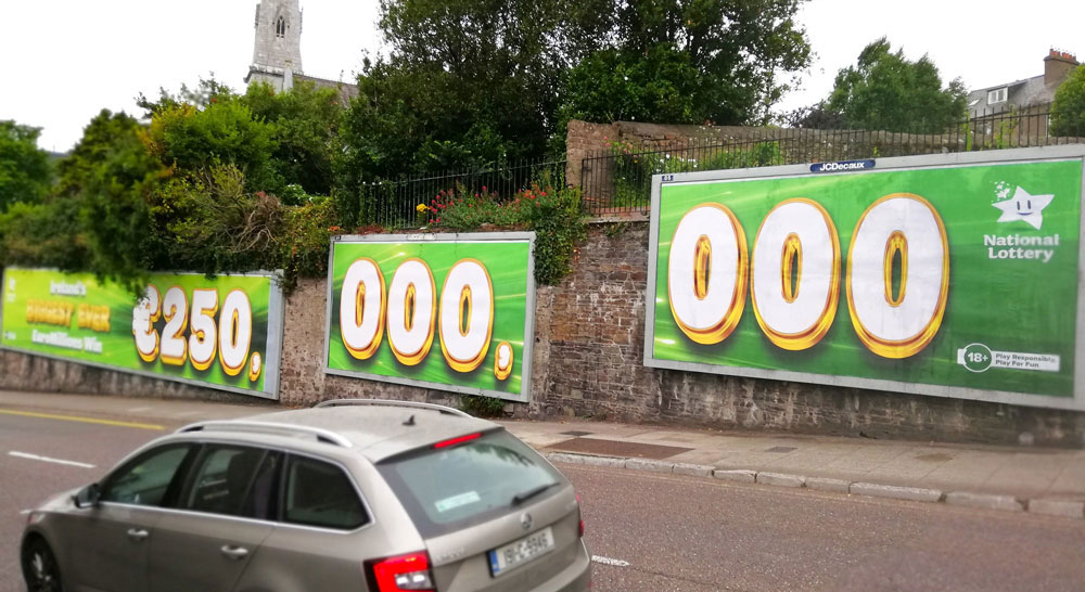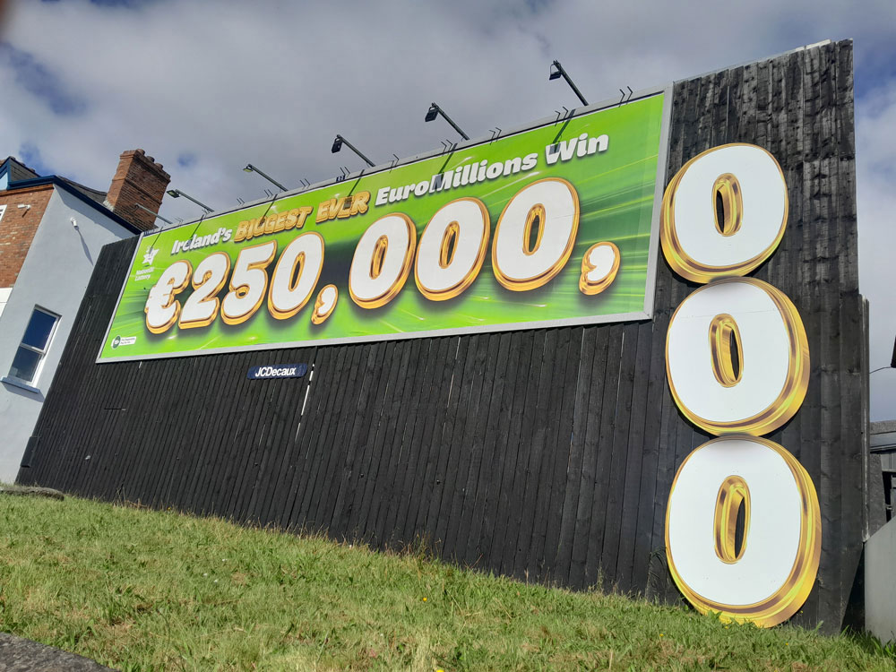 The National Lottery delivered multiple showpiece moments across the year. The All Cash Millionaire “Gold Standard” special on Ushers Quay transformed Golden Square into a shimmering ticket wall complete with a hand breaking through the surface mid-scratch. EuroMillions followed with record-jackpot builds that played with number and scale, from the Botanic Road overflow numerals to a three-panel €250 million sequence in Cork.
