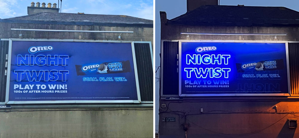 Oreo’s Night Twist completed this close-up strand with neon messaging to unlock a day-to-night reveal that felt designed for the street rather than simply placed on it.