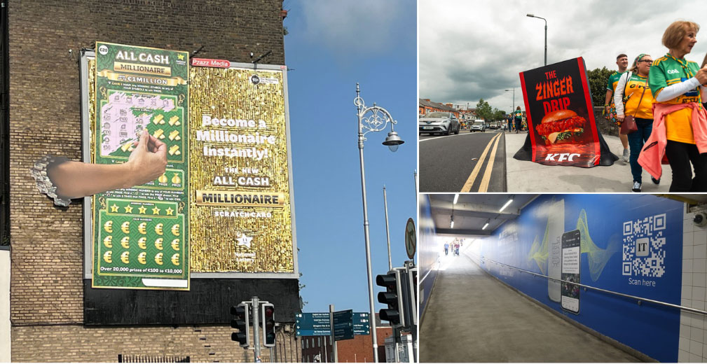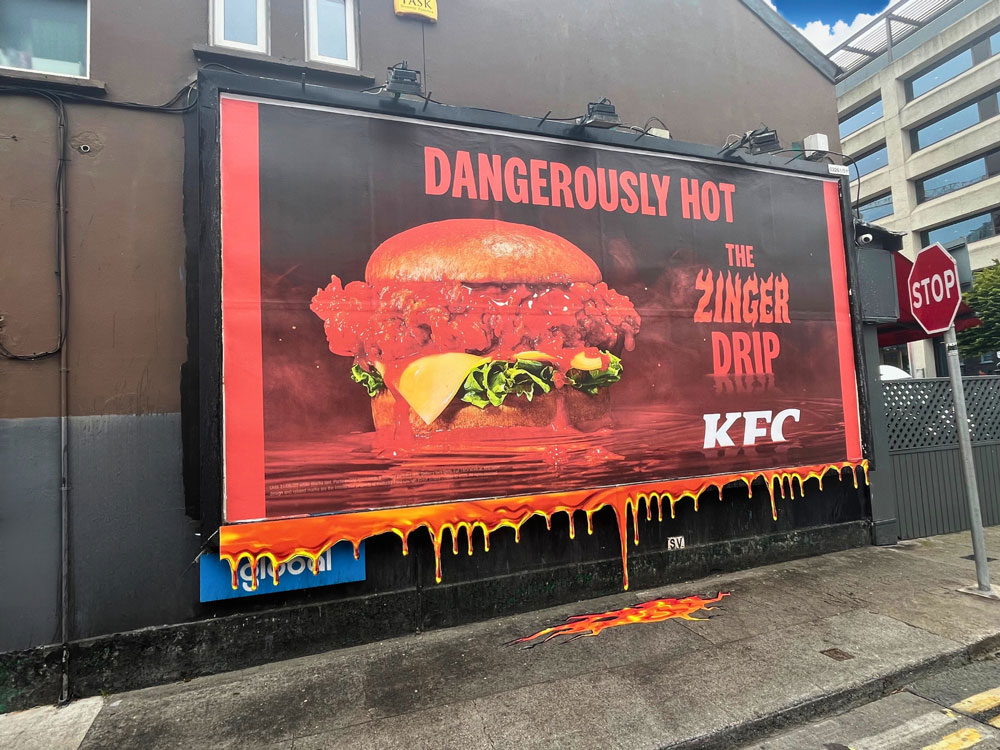 Other brands used structure to make product stories instantly legible. Virgin Media’s “Smoooooth” broadband backlit 96 sheet special build leaned into fluid motion through extended form. KFC’s Zinger Drip turned appetite into spectacle with a 3D sauce pour that appeared to spill off the billboard and onto the pavement while its portable 6 Sheet counterpart created a mobile moment on the GAA All Ireland Hurling finals weekend as it popped up around the capital’s high-footfall zones.