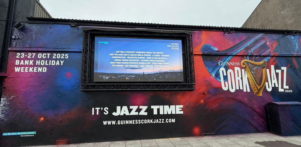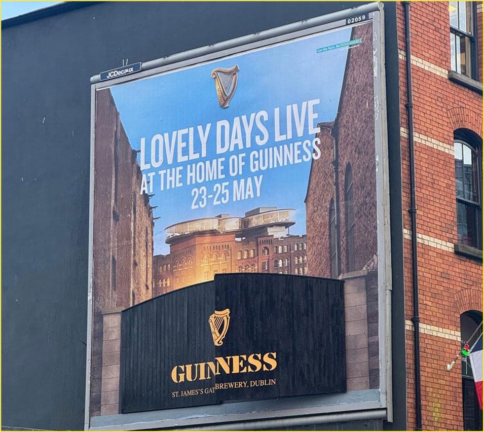In Cork, Guinness anchored the brand’s annual Cork Jazz Festival sponsorship with a massive mural and digital screen pairing showcasing the festival’s lineup at the Kino Events House. In Dublin, the brand’s second annual ‘Lovely Days’ concert series was marked by the installation of replica gates to the Storehouse at Aungier Street’s Golden Square, creating a physical entrance moment that echoed the brand’s most iconic landmark while inviting people into a local venue. These were strong examples of how place-led craft can make Outdoor feel native to the moment rather than layered on top of it.