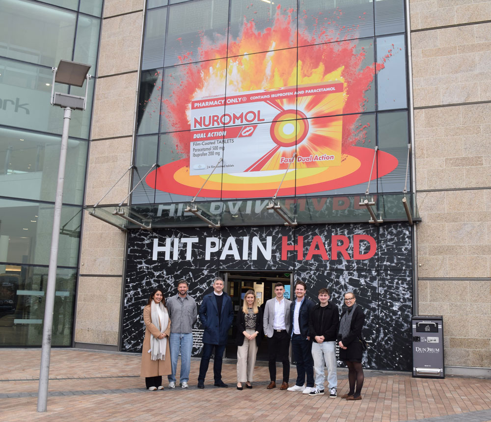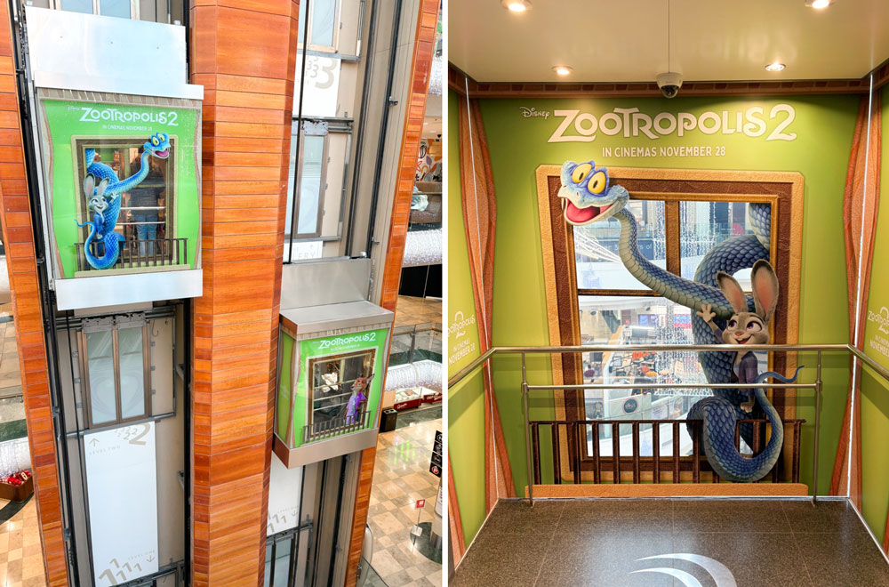 In retail environments, Nuromol made a statement at Dundrum by wrapping the main mall entrance and adding a bowling-themed topper on the interior lift shaft, tying launch creativity into the physical journey through the centre. Zootropolis 2 expanded that idea further with a multi-touchpoint takeover across lifts, interiors, travelator glass and standees that turned parts of the mall into a coherent film world.