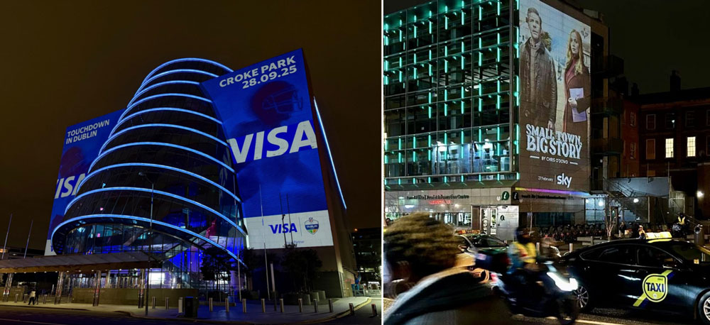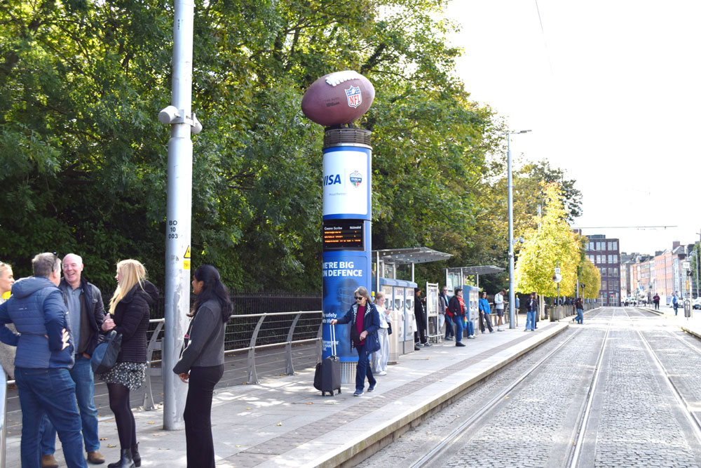 Around the NFL’s Dublin moment, Visa supported the Convention Centre projection with a Luas column football special that extended the takeover into commuter eye-line and helped the wider city activity feel joined-up rather than single-site.