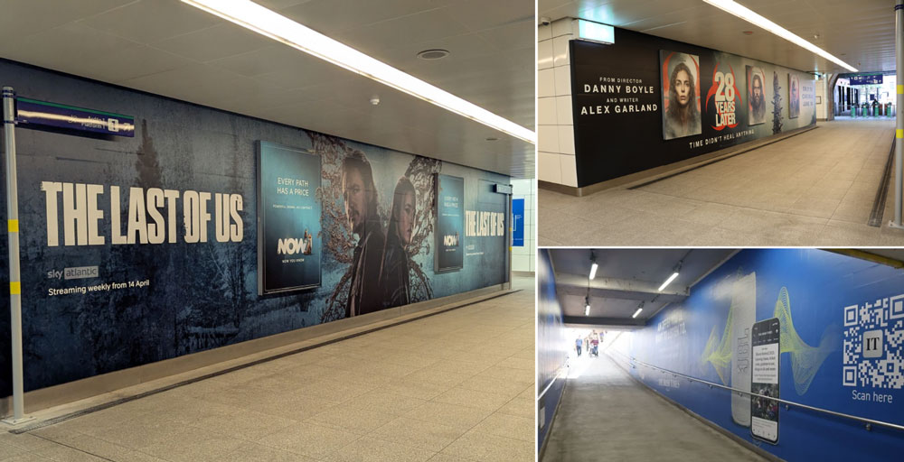 Entertainment launches leaned into enclosed commuter spaces to build atmosphere and anticipation. The Pearse Station underpass was used effectively for storytelling, including The Last of Us and 28 Years Later, proving how repetition through a corridor can feel more like world-building than standard poster rotation.