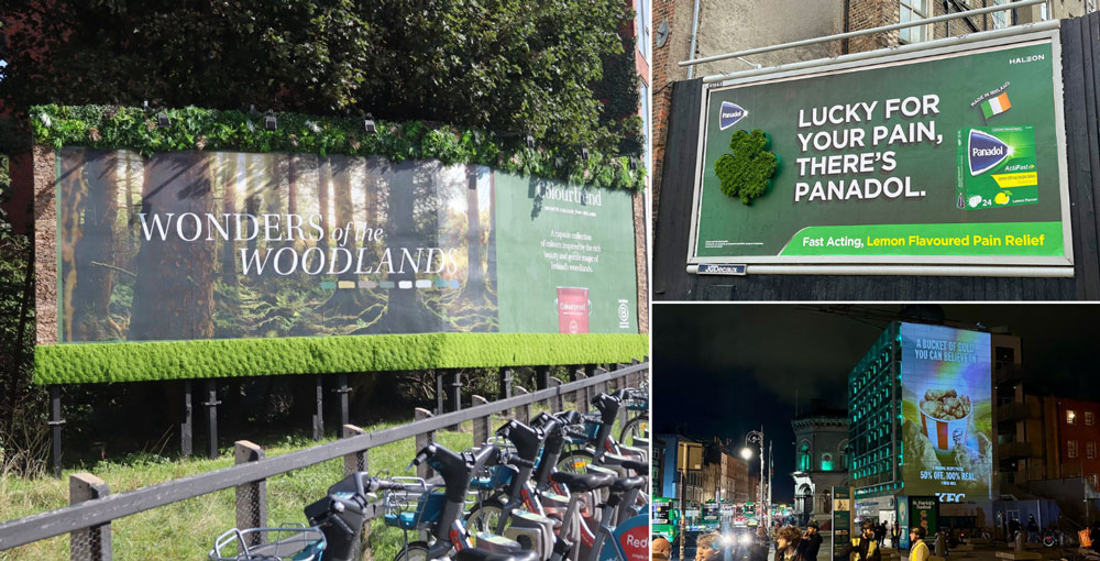 Seasonal and brand-led stories found expression through material choices too. Colourtrend’s foliage-wrapped large format made the surface feel genuinely tactile, while Panadol’s St Patrick’s Day shamrock incorporated actual shamrock to celebrate the Irish-made product on the most Irish day of the year. To round out the same occasion, KFC’s Bucket of Gold brought a short burst of night-time spectacle through a St Patrick’s Day projection tied to the menu item’s promotion window.