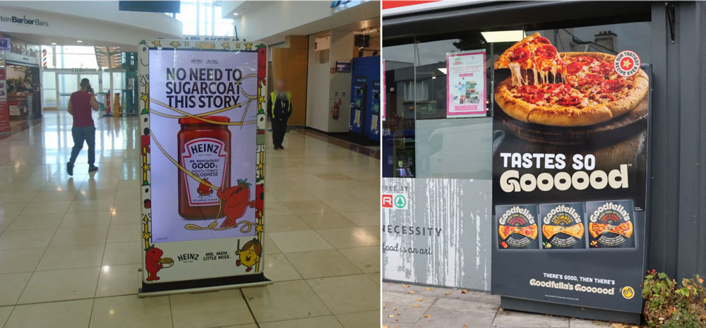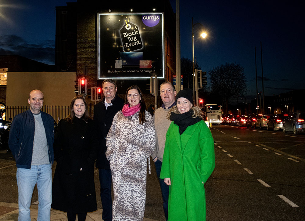 Retail innovation also showed up in smaller but punchy format upgrades. Heinz used Adshel Live Retail to bring character-led storytelling to the store threshold for the brand’s partnership with the popular Mr. Men franchise around the back to school period, while Goodfella’s Adbox Extra added physical presence at the point of decision with frame-breaking pizza creative. Currys anchored Black Friday with a raised Black Tag and perimeter lighting at the Golden Square at Ushers Quay, a compact but high-impact seasonal cue in one of the city’s busiest retail-minded corridors.