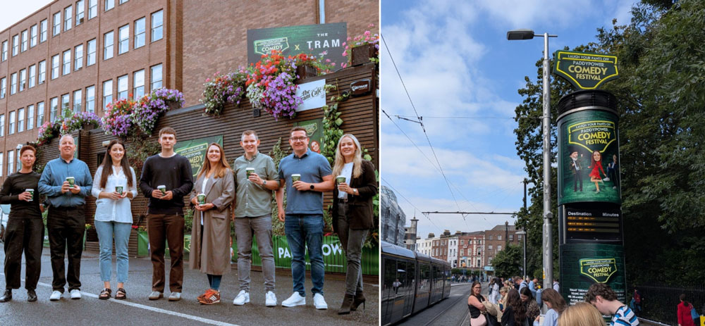 Paddy Power delivered one of the year’s most playful multi-layered runs for the brand’s annual sponsorship of the Iveagh Gardens Comedy Festival. The Tram Café takeover adjacent the venue brought the campaign into real life featuring comedians serving coffee and jokes to customers, supported by a banner at the location, the annual neon “Paddy’s Pants” Luas column at St. Stephen’s Green a fully wrapped LUAS that carried the humour across the city. The combination of venue, transport and supporting media turned sponsorship into genuine street-level theatre.
