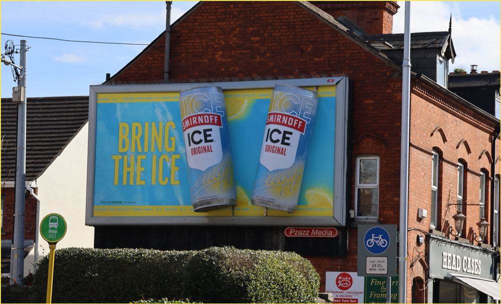 Smirnoff’s 3D build work for the brand’s Ice revival in can form brought the brand’s return to life with product-accurate physicality across special builds on 48 sheets and golden squares, while “out of the screen” forced perspective DOOH effects hit consumers in the off-trade to grab attention.