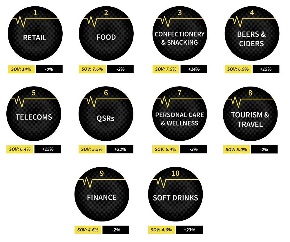 Retail remained the most visible category, contributing nearly 14% of total OOH display value across the year. Leading supermarket chains were responsible for over half of the sector’s activity. Major growth categories include Confectionery & Snacking +24%, Beers & Ciders +15%, Telecoms +15% and Dining +22%.