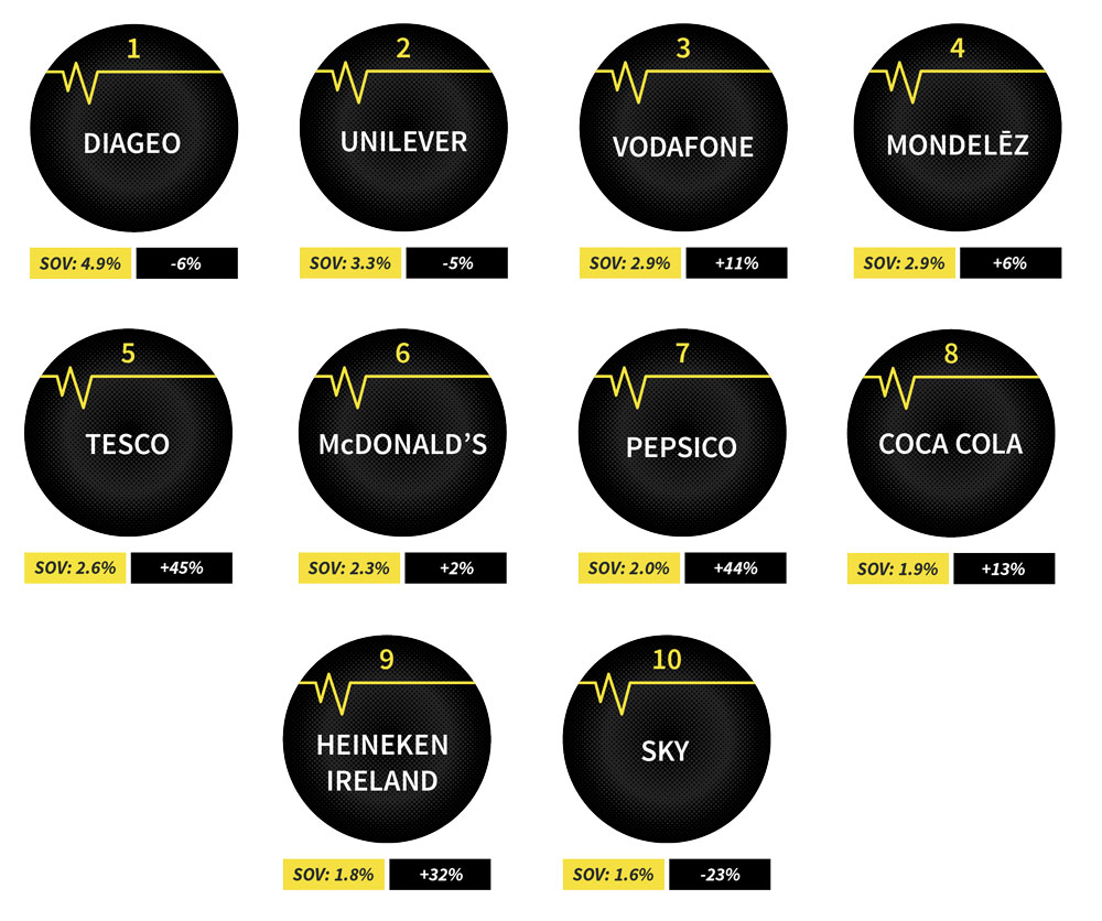 Diageo and Unilever also held position as the top two advertisers. Diageo utilised OOH across roadside, retail and leisure environments in support of its beers and spirts portfolio including Guinness, Rockshore and Smirnoff. In the top 10, the biggest increases in monetary terms came from Tesco +45%, PepsiCo +44% and Heineken Ireland +32%.