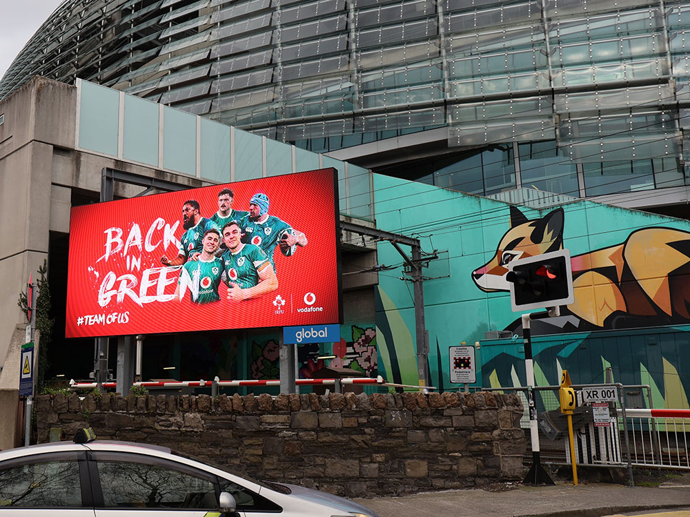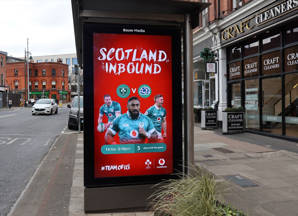 Sport is shaping the streetscape too. With Ireland facing Scotland in Dublin on the Saturday of the festival weekend, the national mood has been building around the fixture. Jersey sponsor Vodafone, planned by dentsu and PML, runs its ‘Back in Green’ creative using Outdoor to rally support ahead of the match, alongside a LIVEPOSTER-enabled dynamic ‘match week’ system that has been running continuously throughout the Six Nations tournament. Will Ireland bring the Triple Crown home in time for the national day of celebration?