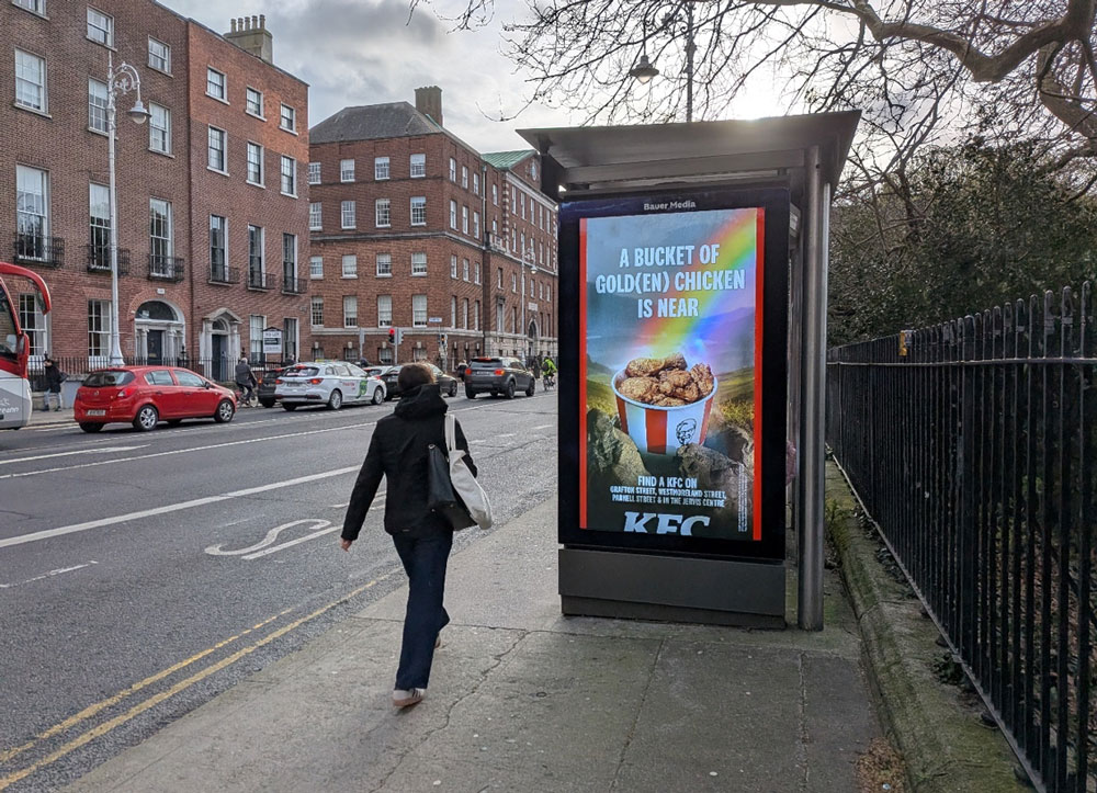 There is a similarly playful reading of the season from KFC, bringing a taste of fortune to St Patrick’s Day with the second annual iteration of its ‘Bucket of Gold’ campaign. Aligning its core offering with the familiar imagery of a pot of gold at the end of the rainbow, the campaign is running in proximity locations to stores in Dublin city centre and Blanchardstown Shopping Centre, ensuring strong visibility in projected high-footfall environments ahead of the festival weekend. The campaign is planned by Spark Foundry and PML.