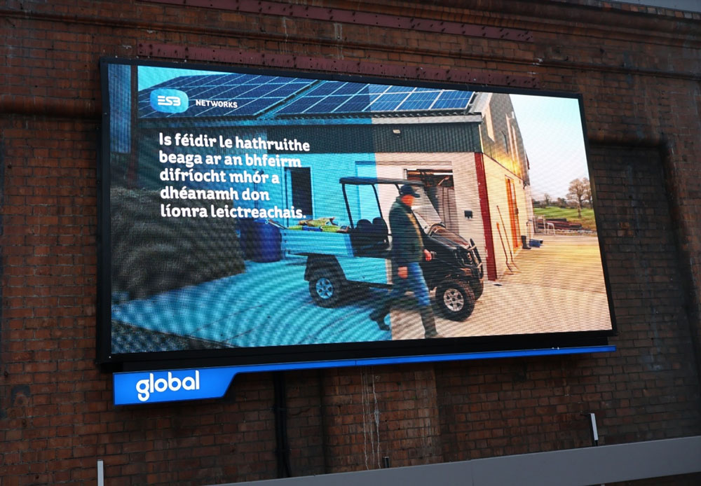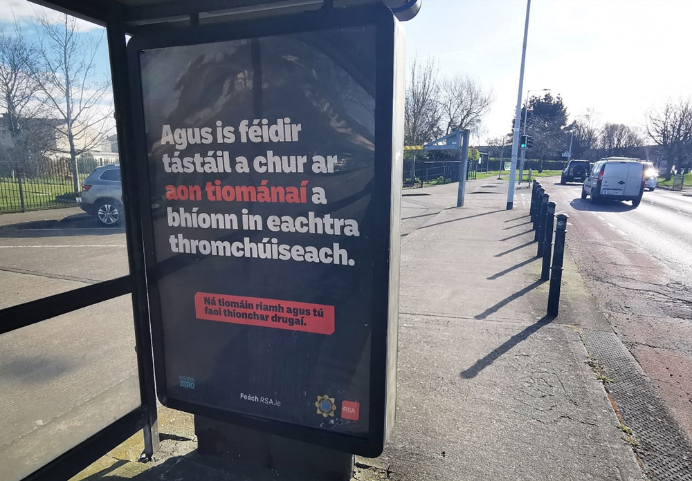 There was also a noticeable presence of Irish-language copy on the streets in the lead-in to St Patrick’s Day, reflecting the wider cultural texture of Seachtain na Gaeilge. ESB Networks, planned by dentsu and PML, ran Irish-language creative across roadside and retail digital panels, using Outdoor to communicate in a way that felt both practical and culturally grounded. The Road Safety Authority, planned by Spark Foundry and PML, also brought Irish-language messaging into the OOH environment through commuter formats, delivering a serious road safety message in everyday spaces.