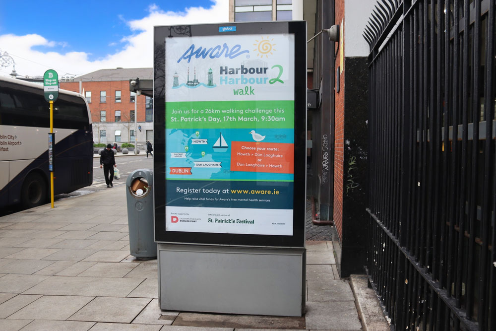 Beyond the commercial campaigns live over St Patrick’s week itself, the wider OOH environment in the lead-in to the occasion also reflected the broader texture of the season. Aware’s Harbour2Harbour Walk, planned by Javelin and Source out of home, returns as part of the wider festival programme, promoting the 26km charity challenge that has become a familiar fixture of the day itself.