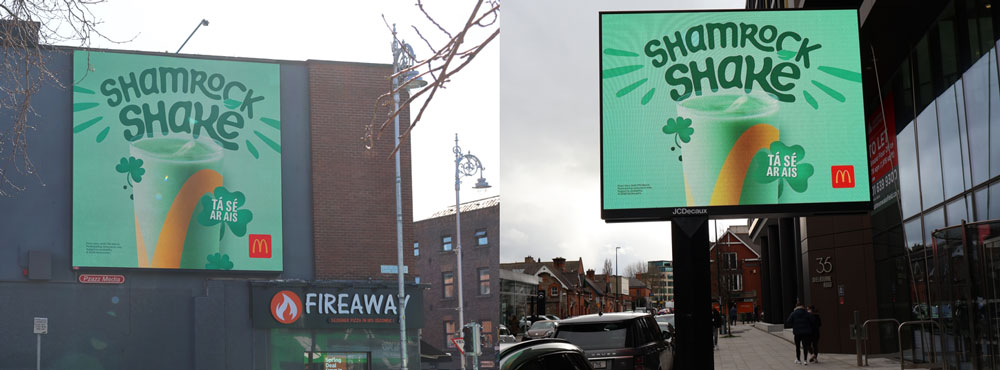 McDonald’s has also returned with the Shamrock Shake, a product that has become a recognisable seasonal cue in its own right. Planned by Zenith and Source out of home, the campaign adds an extra layer of local relevance through Irish-language copy, with ‘Tá sé ar ais’ appearing across digital formats as a simple but effective seasonal message.