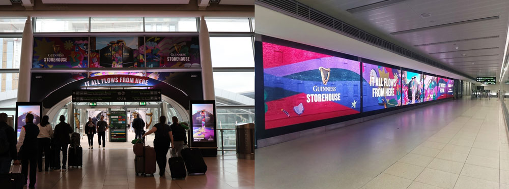 The campaign is also making smart use of the airport environment, greeting arriving passengers at Dublin Airport with high-impact messaging en route to the city. From the exit arch and flanking AerPods to wider airport digital placements, the creative positions the Storehouse not just as a visitor attraction, but as part of the city welcome for those arriving into Dublin for the festival. It is a strong example of how OOH can align with the mindset of arrival and discovery at exactly the right moment.