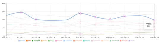 Asking our audiences how they feel about this quarter’s advertising overall, we see a significant drop in campaigns making them feel ‘Happy’.