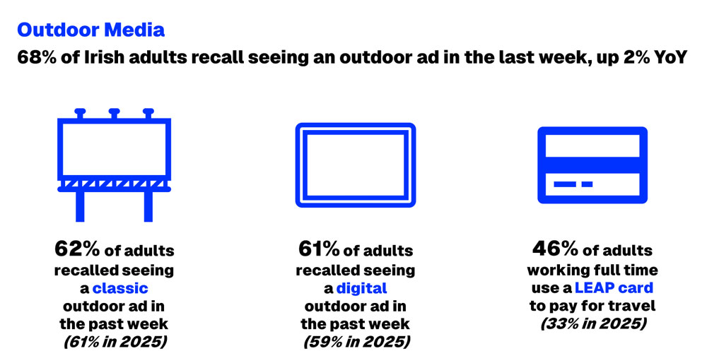 There is a useful contextual cue in the wider mobility picture too. The latest highlights show that 46% of adults working full time now use a LEAP card to pay for travel, up from 33% in the previous year’s charting. For Outdoor, that matters. The medium’s effectiveness has always been tied to everyday journeys, and this latest release underlines just how embedded those journeys remain in the way Irish audiences encounter brands.
