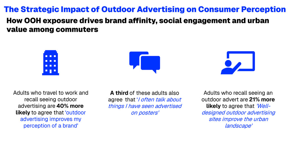 The story then broadens again. Adults who travel to work and recall Outdoor are 40% more likely to agree that it improves their perception of a brand, while adults who recall seeing an outdoor advert are 21% more likely to agree that well-designed outdoor advertising sites improve the urban landscape. A third of these adults also agree that they often talk about things they have seen advertised on posters. That is an important combination. It shows OOH working both as a practical prompt and as a medium that can strengthen brand presence more broadly in public life.