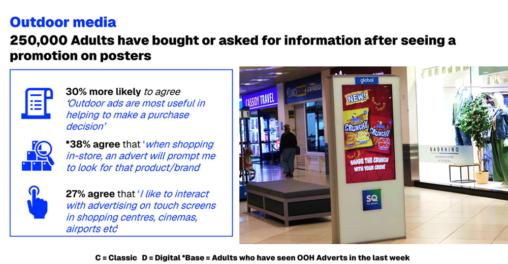 That practical value comes through clearly in the next set of findings. Fifty5Blue reports that 38% agree that, when shopping in-store, an advert will prompt them to look for a product or brand, while those who recall seeing Outdoor are 30% more likely to agree that outdoor ads are useful in helping to make a purchase decision. A further 27% agree that they like to interact with advertising on touch screens in shopping centres, cinemas and airports. This is where the medium starts to move beyond presence and into influence.