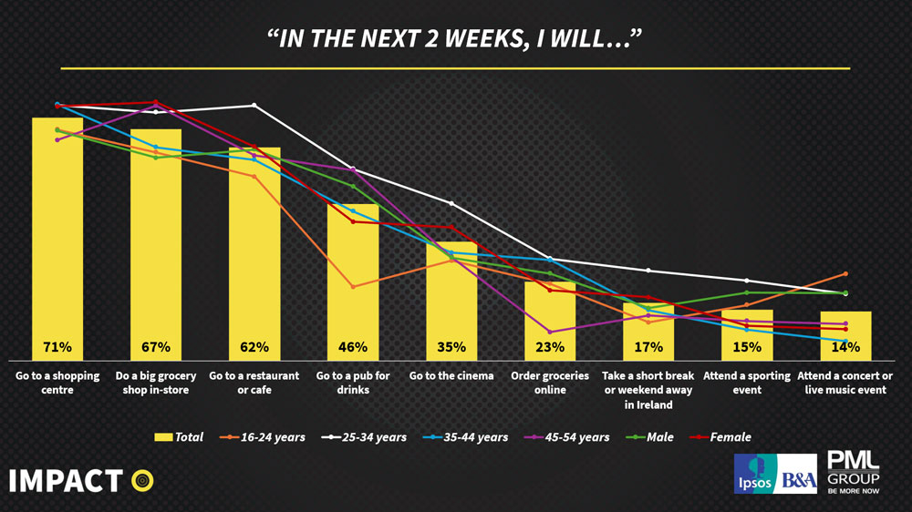 Our latest iQ research, conducted with Ipsos B&A, shows a public that is highly active across the environments where brands can meet them. In the next two weeks, 71% say they are likely to go to a shopping centre, 67% plan to do a big grocery shop in-store and 62% expect to visit a restaurant or café. Almost half, 46%, are likely to go to a pub for drinks, while 35% say they are likely to go to the cinema.